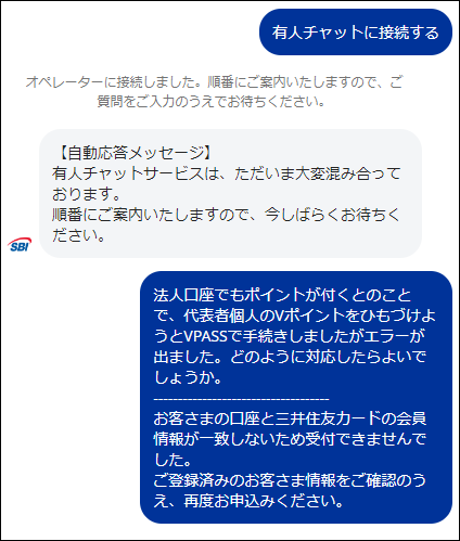 法人口座でVポイントと登録できないことを相談したら、法人はTポイントしか連携できないと言われてしまいました。