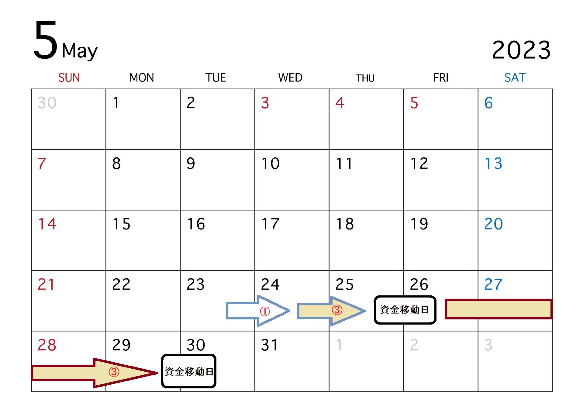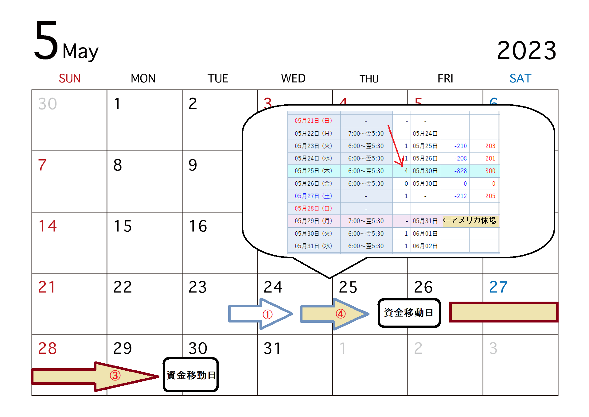 例えば、2023年5月29日(月)はアメリカが休場で、その影響で5/24(水)のFXポジションを5/25(木)に持ち越すことでスワップが4日分もらえました。