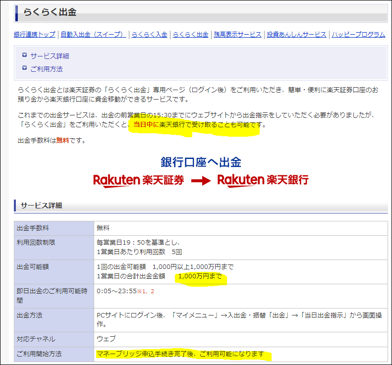 楽天証券は1000万円まで即時出金できます。楽天証券FXのスワップ3倍デーは水曜の引け(木曜の朝)です。他の業者だと木曜から金曜にかけては出金されない待ち時間となりますが、楽天銀行と楽天証券をマネーブリッジでつなげば1000万円まで即時出金してもらえます。待ち時間が1日減る分スワップをもらえるチャンスが増えますね。